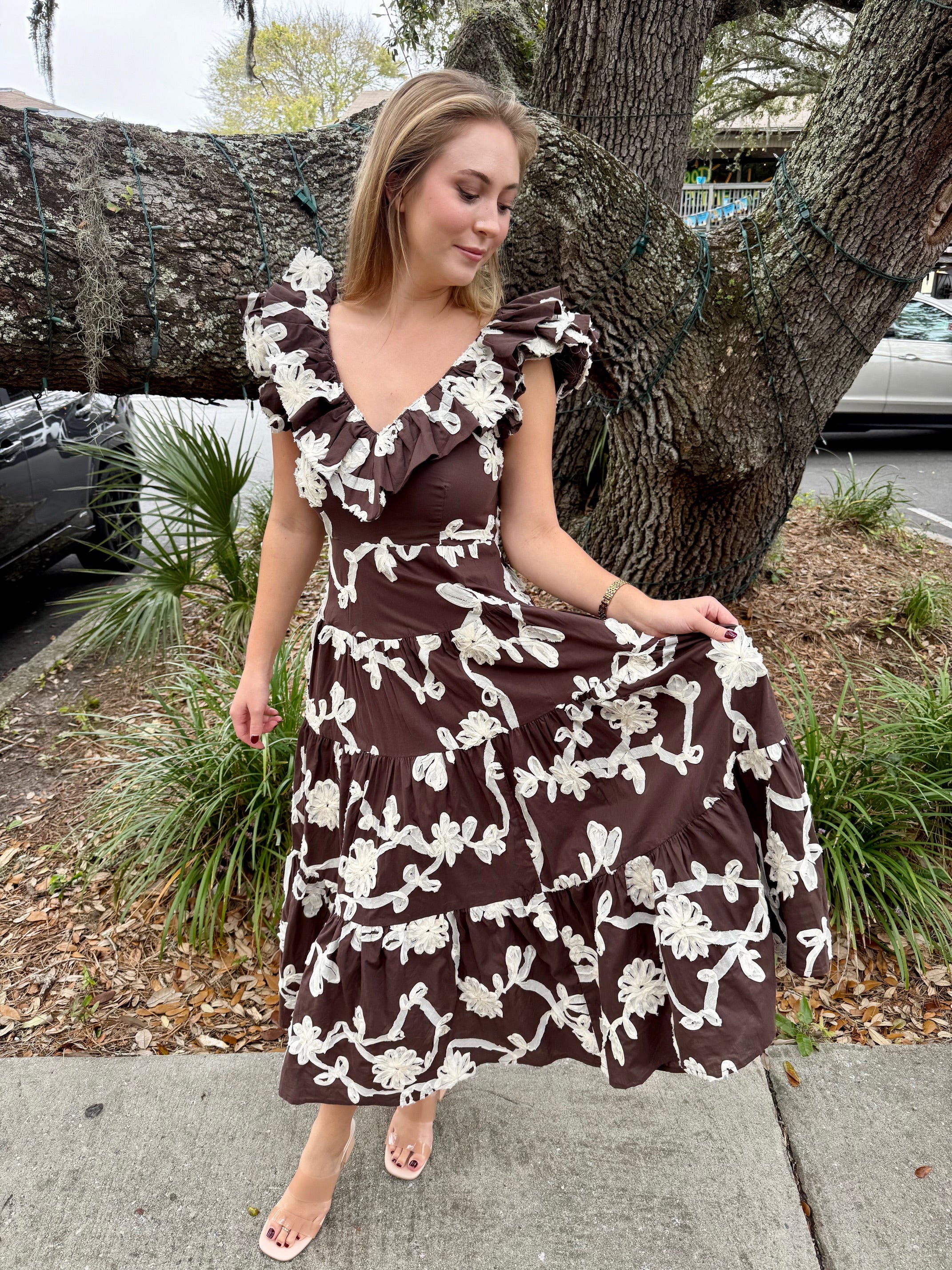 A button-front mini dress showcasing an allover botanical line print. Designed with a mandarin collar, defined waist seam for a flattering fit-and-flare silhouette, and long puff sleeves with wide buttoned cuffs. Finished with a softly flared skirt.